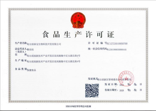 哈尔滨林宝生物科技开发有限公司取得保健食品生产许可证